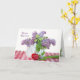 Lilac bouquet with single red tulip on chequered tablecloth.