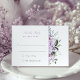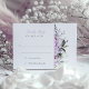 This wedding RSVP card is a symphony in lavender and sage, with a vertical array of watercolor florals gracing the right-hand side. The flowers bloom in shades ranging from the deepest plum to the lightest wisteria, nestled amidst a medley of olive and eucalyptus green leaves. A whisper of ivory peeks through the petals, harmonising with the pristine white background. The centre features a stately script in a soft purple shade, inviting guests to reply with grace. This card encapsulates the essence of a serene garden and is a beautiful way for guests to confirm their attendance.