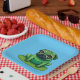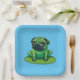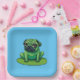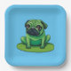 Cute green Pug resembling a frog sitting on a lilipad. Background colour can be changed.