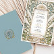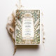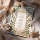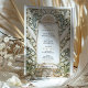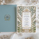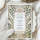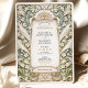 This refined Art Nouveau wedding invitation captures the delicate beauty of white lilies of the valley intertwined with sweeping foliage and ornate scrollwork. The front side showcases an ivory and pale gold frame adorned with sculptural floral accents, creating a sense of movement and romance in the true spirit of the Art Nouveau movement. Soft teal and cream hues form the background, emphasizing the elegance of the botanical forms that curl naturally around the bordered text space.