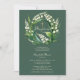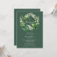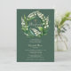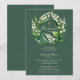An elegant and sweet baptism invitation for a girl, featuring a wreath of lily of the valley flowers on a dark sage green background. A stylish and classy invitation for a baby girl's baptism or Christening.
