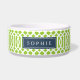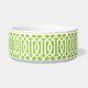 Cute customised cat or dog food bowl with a lime green imperial trellis pattern and rectangle frame placeholder for your beloved pet's name.