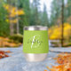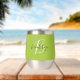 This personalised thermal wine tumbler features a monogram and first name in modern black and white script on a trendy lime green background.