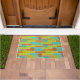 This doormat has a mid-century modern design of repeating rectangles in lime green, cinnamon brown, and turquoise with circles layered on top.