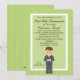 Start your celebration off with this adorable invitation for that special boys First Holy Communion. It has a lime green with light green striped border. in the centre there's a light green centre with a white border around it There's an adorable boy wearing a grey suit with a blue tie . He has brown hair. Check out the many other items in this line such as labels, postage, thank you notes, and more.