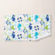 A cute nautical pattern in colours of lime green, navy blue and sky blue is the feature on this three piece bathroom towel set. Images in the pattern include cute whales, life buoys, anchors, and lots of bubbles! Everything is placed on a white background. The bottom of the bath towel is solid matching navy blue, except for a green line border, and your monogram on a white ornate banner lined in green. Kids of all ages will love it!