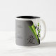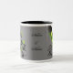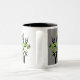 Love Birds On Sakura Tree And Chinese Love Symbol Mugs. A lovely mug with an Asian flair featuring two love birds on a blooming sakura tree with lime flowers under a grey, curled page and the Chinese love symbol on the right and another sakura tree on the left. Personalise it with your text.