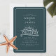Line art illustration of WEDDING text incorporated into design featuring sun, seagulls, and ocean waves. White text over dark slate green background with rounded rectangle border.