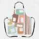 This apron has a mid-century modern design of lines and rectangles in retro shades of red, yellow, orange, blue, green, brown, and pink.