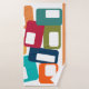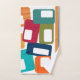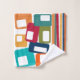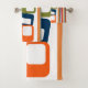 This towel set has a mid-century modern design of lines and rectangles in retro shades of orange, gold, cranberry, teal, green, blue, turquoise, and green.