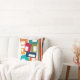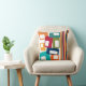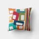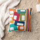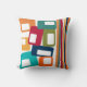 This throw pillow has a mid-century modern design of lines and rectangles in retro shades of orange, gold, cranberry, teal, green, blue, turquoise, and green.