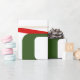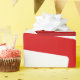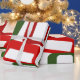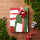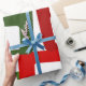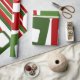 This wrapping paper has a mid-century modern Christmas design of lines and rectangles in retro shades of red and green.