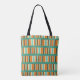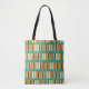 This tote bag has a mid-century modern design of horizontal lines made of vertical stripes in seafoam, off-white, two different oranges, and brown.