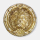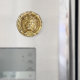 A sculpted golden lion peers benevolently through a roman frame.