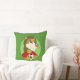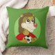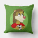 Pillow with illustration of head of cute smiling lion dress in red sports dress holding a football ball, in green circle, illustrated by Radka Kavalcova