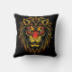 Striking artistic representation of a lion's head against a black background. The lion is depicted with vibrant colours, primarily reds, yellows, and oranges, creating a fiery appearance. The mane is exaggerated with flowing lines, adding a dynamic quality to the design. The facial features are strong and bold, showcasing a fierce expression, with piercing eyes and prominent whiskers.