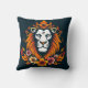 Stylised lion's head at the centre, adorned with a crown. The lion's mane is illustrated with vibrant orange and yellow colours, resembling flames.