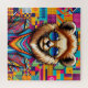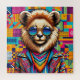 The image is a digital illustration of a lion dressed in a stylish manner, standing in the centre against a vibrant and colourful geometric background. The animal has round sunglasses with blue lenses and a jacket that boasts colourful geometric patterns. The animal's pose and accessories suggest a cool and confident demeanour. The backdrop is a kaleidoscope of colours, including yellow, red, blue, orange, brown, and green, composed of various irregular geometric shapes that contribute to creating a lively and dynamic atmosphere.