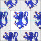 This design by Richard H. Fay features a heraldic lion rampant azure, a blue lion depicted in profile rearing up on its hind legs, ready to stave off all attackers.