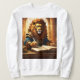 Generate an image of a lion-man wearing glasses, writing on a parchment with a quill. The scene is set in a fantastical world.