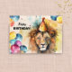 Celebrate birthdays with the strength and pride of a lion birthday card. Featuring a lion wearing a party hat, this greeting card exudes a bold and majestic vibe. The watercolor art illustration is rich in detail, bringing out the raw beauty of the big cat. Embrace the untamed spirit with this zoo animal-themed greeting card.