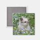 A magnet featuring a lionhead rabbit in a bed of forget-me-nots.