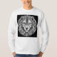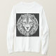 Hghly detailed and stylised illustration of a lion's face. The lion is depicted in black and white, showcasing intricate line work that emphasizes its mane and facial features. The eyes of the lion are piercing and full of expression, drawing attention. Surrounding the lion's head is a decorative circular design that complements the figure, adding an element of symmetry and depth. The contrasting black background highlights the detailed artistry and gives the overall composition a striking and majestic appearance.
