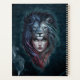 Lion's heart and feminine strength, a majestic fusion. This is a striking portrait of a woman whose appearance is complemented by a seamless fusion with the head of a majestic lion. The woman has fair skin and bright green eyes, framed by a delicate white pattern, emphasizing her expressiveness. Her hair is styled to blend seamlessly into the lion's mane—a flowing union that creates the impression that they are one. The lion's mane is painted in blue-grey tones, lending the image a powerful presence, while the lion's piercing eyes convey an intense gaze.