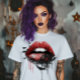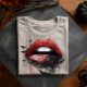 This tee has large red lips on it with black lace and bats on them. There is fluid running from the lips in dribbles.
