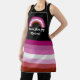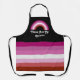 Women's apron with an image of a lipstick lesbian pride flag and a rainbow; pink, white, and orange design on a black background, with a customisable text template for your own name or message