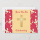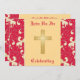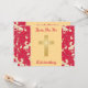 This wedding invitation is decorated with a Christian cross and Lipstick Red and gold damask bars on a gold damask background.
