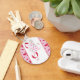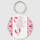 This favour keychain is decorated with the colours Lipstick Red and Pale Pink in damask bars superimposed on a white background