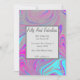 A stylish silver frame and text on a pink, teal and blue liquid marble background birthday invitation.