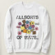 Sweatshirt features an original marker illustration of a handful of pastel-coloured liquorice allsorts candies, with ALLSORTS OF WAYS... in a fun font. Perfect for your favourite foodie!