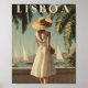 This charming vintage poster depicts a graceful woman in a classic 1950s dress standing at the harbour in Lisbon. Fishing boats gently float on the water behind her, while the sun casts a warm, golden glow over the historic buildings in the background. The soft retro colour palette and nostalgic textures capture the elegance of mid-century coastal life in Portugal. Perfect for lovers of vintage fashion, seaside scenes, and timeless European travel art.