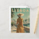 This charming vintage poster depicts a graceful woman in a classic 1950s dress standing at the harbour in Lisbon. Fishing boats gently float on the water behind her, while the sun casts a warm, golden glow over the historic buildings in the background. The soft retro colour palette and nostalgic textures capture the elegance of mid-century coastal life in Portugal. Perfect for lovers of vintage fashion, seaside scenes, and timeless European travel art.