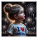 A little American girl with her hair tied up in a messy bun gazes upward in wonder at a dazzling display of fireworks and wearing an "I Love America" t-shirt