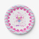 Little Angel 1st birthday party paper plates features a little girl angel ballerina with pink wings, a blue tutu, and flower wreath with halo surrounded by lots of little pink stars! Pink text reads This Little Angel is One Today! The plate border has chevron stripes of blue, pink, white, and hot pink. Your little angel turning one year old will love these colourful, girly angel birthday paper plates!