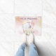 On a pastel pink and yellow watercolor background, this fresco style painting of an adorable baby goat blowing a bubblegum bubble says HI! & Welcome (You can change this text) Goat Lovers Welcome Mat -