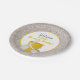 Adorable, gender neutral baby shower design for the beach lover Mummy to be! Design features a background of grains of sand. In the centre is a white circle with yellow trim. At the bottom of the circle is a yellow pail and a white shovel. Next to the pail is a white sea shell. Above the sea shell and pail is text in dark grey and yellow font that says Welcome Little Beach Baby. This fun, all about the beach themed baby shower design is perfect for the Mummy to be that lives near the beach or just love the beach! This smaller sized plate is great for serving up baby shower cake and desserts.