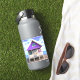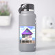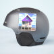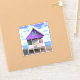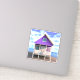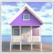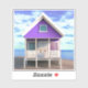 Sticker in a cute little beach shack / vacation house on stilts, painted white and purple, on the sand, with a blue sky and white clouds