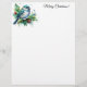 A watercolor and splatter paint image of a cute, little bird perched on an evergreen branch with red berries creates a charming holiday stationery. Perfect for anyone who loves birds and nature.