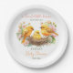 Little birdie hatching soon spring baby shower template plates personalised baby shower tableware, pair of cute yellow canary birds with a hatchling chick in a nest with spring blooms baby shower party paper plates