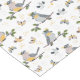Little birds and butterflies are the features in the cute boho style pattern on this table runner. Colours used include gold, grey blue, and green, and the images are placed on a white background.
