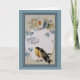 The front of this pretty Easter card has a wonderful vintage image of two little yellow and gray birds at the bottom of an oval formed by daisies and delicate blue flowers. Text within the image says "Happy Easter" in French. The image and text are framed in blue, and placed on a lighter blue background. The inside of the card has two text fields for you to customize. *Please note - as this is a vintage image, it contains irregularities in print, which is common for images from that era, and is not an error in printing.
