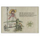 Step into the whimsical world of classic children's literature with this charming illustration of Little Bo-Peep, brought to life by the iconic artistry of Kate Greenaway. This delightful image captures Bo-Peep, shepherd's crook in hand and wearing her characteristic straw hat and simple dress, leaning pensively on a wooden fence. Below the illustration, the beloved nursery rhyme text "Little Bo-Peep has lost her sheep..." is presented in an elegant, antique-style font. This timeless piece embodies the innocence and charm of 19th-century children's book illustrations, perfect for those who cherish nostalgic storytelling, vintage art, and traditional nursery rhymes.