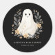Little Boo Boho Ghost Halloween Baby Shower Classic Round Sticker features an adorably spooky ghost, surrounded by bohemian botanicals.