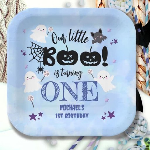 Little Boo! Cute Blue Boy Halloween 1st Birthday Paper Plate