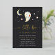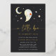 Celebrate your spooky season baby shower in style with this charming gold foil invitation. Featuring a hand-lettered “A Little Boo is Almost Due” in luxe foil, a sweet ghost illustration, and a deep charcoal background scattered with stars and a crescent moon, this card is a perfect blend of playful and elegant. Ideal for fall or Halloween-themed baby showers, it’s printed on premium cardstock with shiny foil lettering that adds a magical touch to your event. Personalise all the details to make it your own.