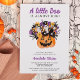 A little boo is almost due! Celebrate your baby shower this Halloween with this cute hand painted watercolor little pumpkin with a bouquet of ghosts, pumpkins, bats, black and purple flowers, branches illustration in white, orange, and purple, black with a cool modern script font and an Perfect gender neutral baby shower.